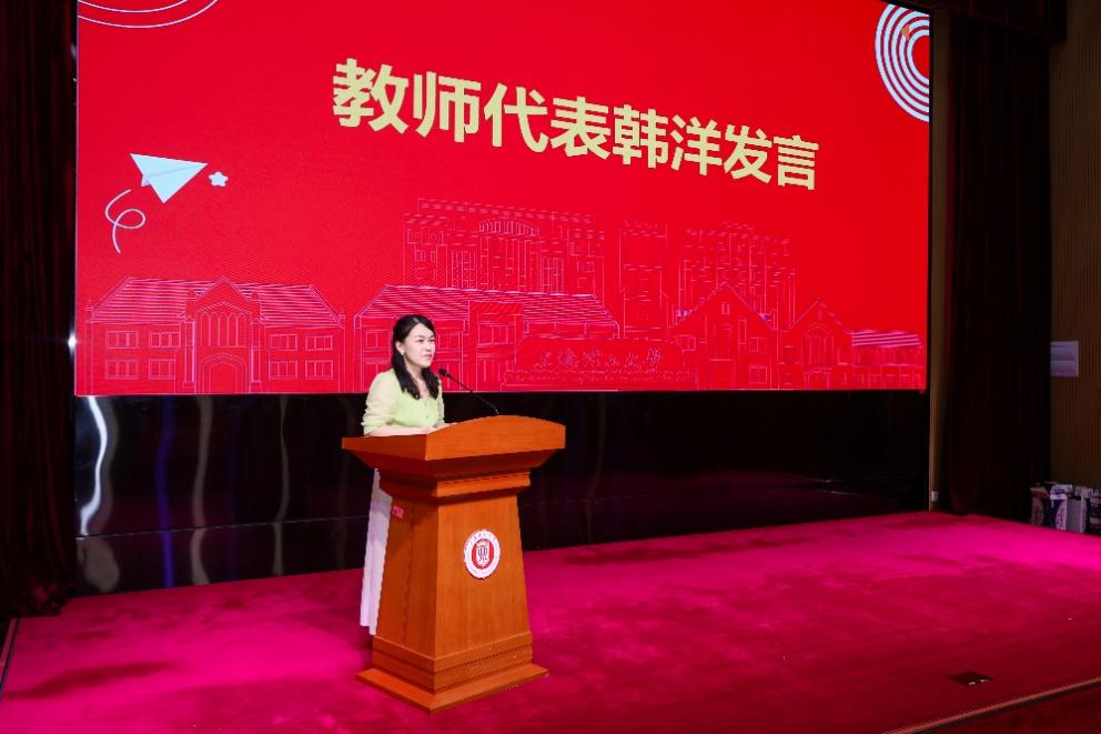 続いては、教員代表として英語学科副科長の韓洋博士が「言語が持つ人間的な温かさと科学技術との融合」をテーマに講演し、自主的で学際的な探求を通じ、文化的な洞察と技術革新を兼ね備えた複合型人材となるよう、新入生を鼓舞した。